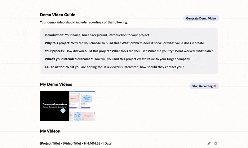 Once you've select a project idea, select 'start building' to generate a step-by-step project guide with recommended tools and classes. As you build, make sure to record your screen so we can create a custom video cover letter to show off your project to your target company!